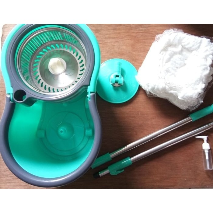Mekanisme pengeringan berputar dalam member akan membuat pekerjaan rumah mengepel lantai menjadi mudah, meringankan tangan dan punggung anda dari usaha fisik yang berat dan menghemat waktu anda.Dengan putaran 360 derajat untuk pel dan pengeringan dalam member, anda dapat mengatur jumlah air yang diinginkan dan tidak membuang waktu anda untuk menunggu lantai anda kering.Material : plastik dan besi stainlessPaket yang didapat :1 bh keranjang kering putar (besi Stainless)1 bh pegangan pel (dapat dipisah kan menjadi dua agar mudah disimpan)1 bh microfiber pel2 bh kepala pel1 bh buku instruksiDimensi produk : 45,8 x 26,5 x 21,5 cmDimensi paket : 46 x 27 x 27 cmBerat produk : 450gr #spinmop #pel
