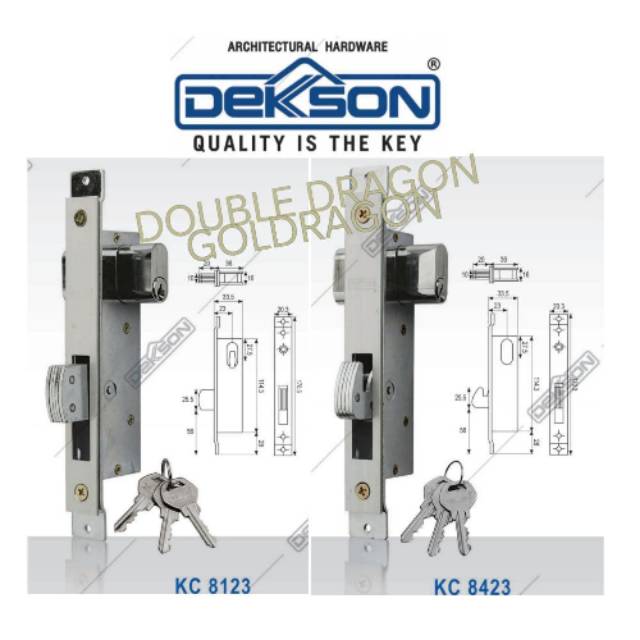 Kunci Aluminium- Merk : DEKKSON- Type : KC 8123 (Swing) dan KC 8423 (Sliding)- Backset : 23 mm- Dimensi : sesuai foto/ga