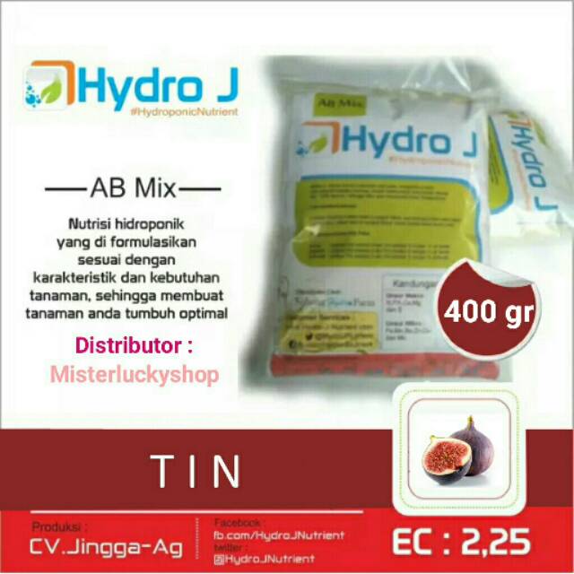 Apa itu Hydro J :Nutrisi Hydroponik siap pakai, mengandung unsur hara yang dibutuhkan tanaman, dengan bahan - bahan yang mudah diserap dan 100% larut Air, sehingga tidak akan menyumbat sistem fertigasi tetesCara Membuat Pekatan :Larutkan Kantong A dalam botol A menjadi 1L, dan kantong B plus unsur micro (warna hijau) dalam botol B menjadi 1L, Kocok sampai benar - benar larutPembuatan Larutan Siap Pakai :Semai : Larutkan 3ml pekatan A dan 3ml pekatan B dengan 1L air bersihVegetatif : Larutkan 5ml pekatan A dan 5ml pekatan B dengan 1L air bersihGenetatif : Larutkan 7ml pekatan A dan 7ml pekatan B dengan 1L air bersihKandungan dan Jenis :Unsur Makro : N,P,K,Ca,Mg dan SUnsur Mikro :Fe,Mn,Bo,Zn,Cu,dan MoEC : 2,25#HydroponicNutrient#Nutrisitin#Misterluck