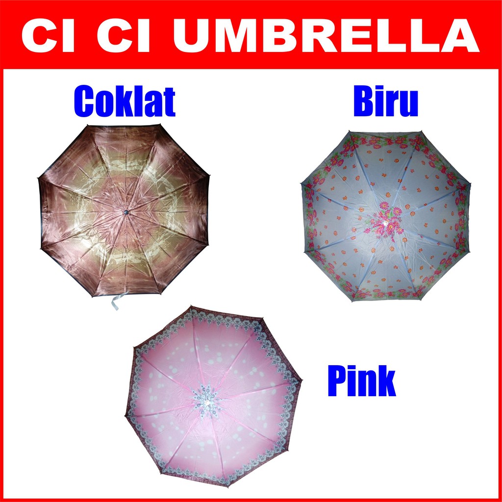 Payung bukan hanya bisa dijadikan sebagai pelindung di saat hujan tapi juga dapat digunakan pada saat terik sinar matahari yang sangat menyengat. Selain itu payung juga dapat menghindari kulit anda supaya tidak terbakar. Payung ini juga bisa menjadi pelengkap fashion musim hujan yang akan membuat kamu tampil semakin trendy. Cocok untuk kamu yang ingin tampil fashionable dan tetap cantik dan juga sebagai hadiah untuk orang yang kamu sayangi.Merek: Ci CiTersedia 2 motif:- Biru (motif bunga)- CoklatPerhatian !!!Untuk warna pink : tidak tersedia / stok kosong.Silahkan lihat pilihan warna di halaman gambar di atas (kecuali pink). Warna (motif) bisa dipilih sesuai selera.- Payung exclusive, simple dan mudah dibawa karena bisa dilipat dan praktis sampai bisa masuk ke tas wanita. Pada umumnya panjang payung lipat hanya sepanjang 25 cm.- Rangka hitam membuat payung menjadi anti KARAT- Bahan gagang kokoh.- Warna tulang: hitam- Warna gagang besi : Hitam- Ukuran panjang kondisi dibuka :* Biru: 53 cm* Coklat: 55 cm-Diameter :* Biru: 94 cm* Coklat: 94 cmSetiap pembelian payung sudah termasuk tas jinjing (tas khusus). Jadi bisa lebih enak dibawa kemana-kemana.Produk sudah dicek dan tidak ada bagian rangka atau gagang yang cacad maupun yang patah.Harap mencantumkan keterangan pilihan warna (motif) termasuk warna (motif) cadangan. Apabila tidak ada keterangan, maka akan dikirim random.Kualitas terjamin- Terima kasih atas kepercayaan Anda.- Selamat berbel