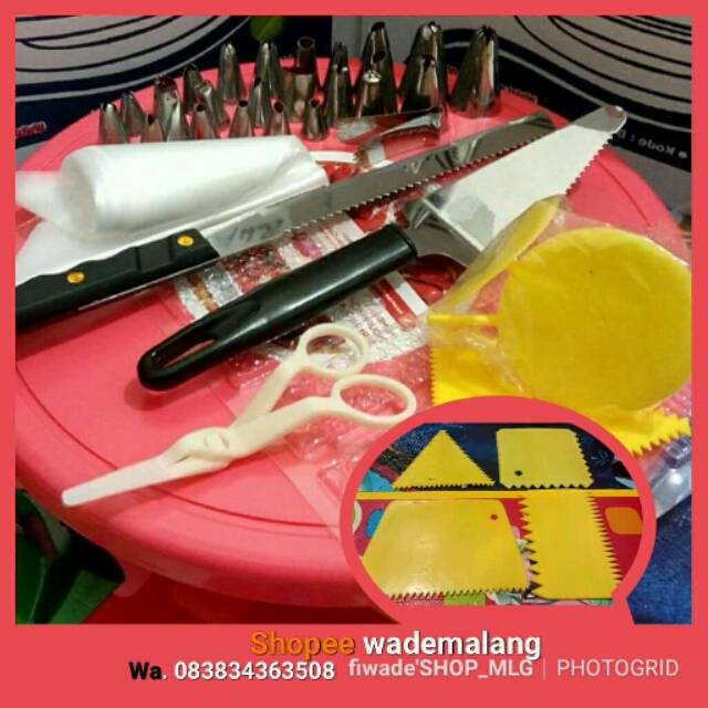 - (malang-bunul-blimbing)Wa.0838-3436-3508Isi paket 9item√ cake tray √ spuit set komplit ±20pcs√ paku mawar set plastik (3pcs beda ukuran)√ pisau 2sisi√ pisau spatula segitiga plastik atom tebal√ scraper bisa pilih (inbok/komen/chat)√ cet.pagar√ gunting mawar√ pipigbag 10lembarWa: 083834363508"Transfer HARI INI KIRIM BESOK"RESI??????......minta h+1 pengiriman(alias h+2 TT/transfer)Mau cepat resinya lewat SHOPEE otomatis ter.input https://shopee.co.id/wademalangCC. Fiwade III Fiwade M