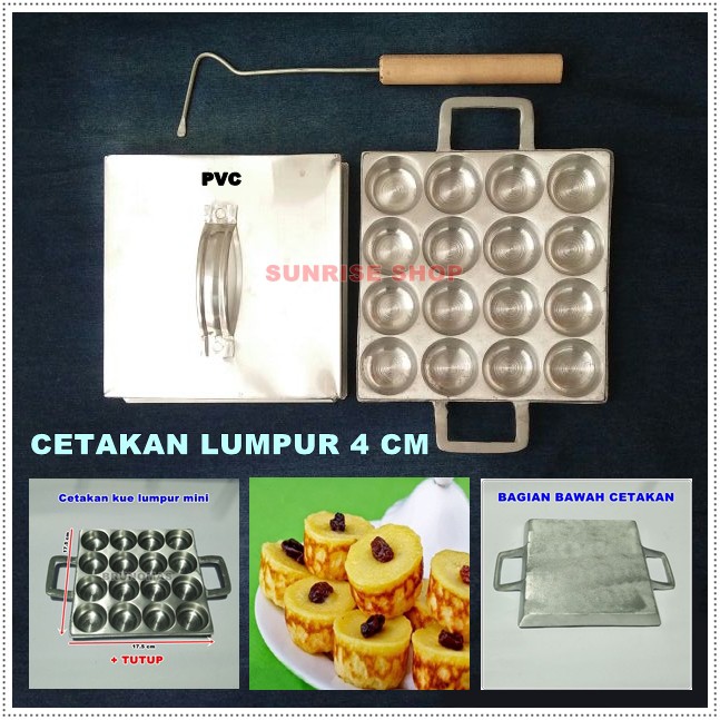 CETAKAN KUE LUMPUR MINI 4CMKode : PVCFREE CUNGKILAN KUEUkuran CetakanPanjang : 17.5 cmLebar : 17.5 cmBerat : 800 gramBahan : Alumunium sistem corUkuran KueDiameter Kue 4 cmTebal :
