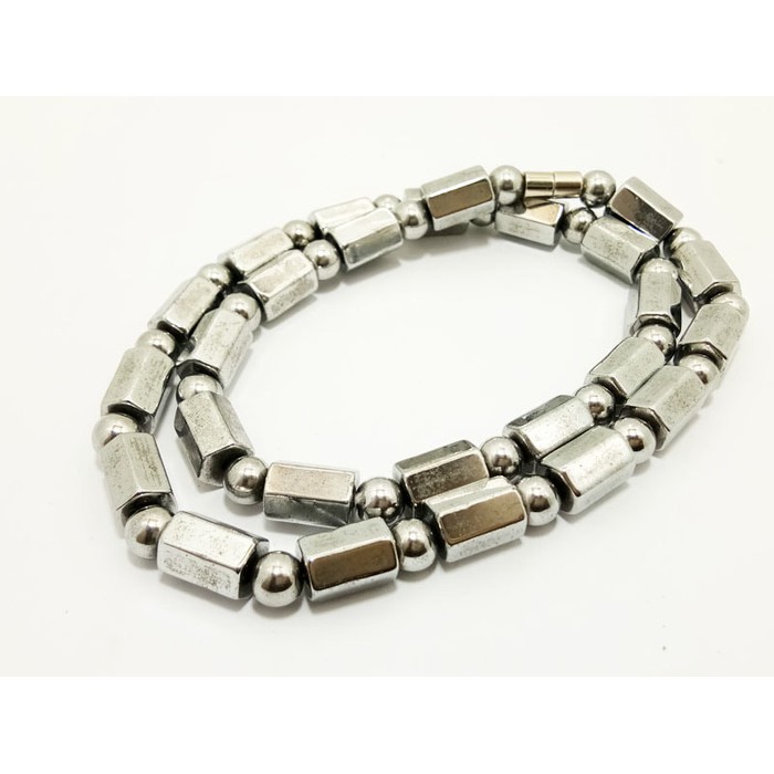 Kalung ini terbuat dari Hematite Magnetic Stone yang sangat bermanfaat bagi kesehatan. Hematite Magnetic Stone merupakan barang impor dari Korea yang diolah menggunakan teknologi Jerman sehingga sangat berbeda dengan magnet biasa yang beredar dipasaran.Kalung ini dapat melepas ion negatif konsentrasi tinggi dan medan magnet yang adatif terhadap tubuh manusia secara cepat dan konsisten, tidak hanya dapat meningkatkan oksigen dalam darah tetapi juga dapat mengatur sirkulasi darah, efektif meredakan nyeri tubuh dan menangkal radiasi lingkungan.Kalung ini dirangkai menggunakan karet elastis, sehingga sangat menyesuaikan dengan ukuran pemakaiSpecifications:Jenis Butiran : Tabung (25 buah), Dim 13 x 9mmBola (25 buah), Dim 8 x 8 mmJumlah Butiran : 25 tabung + 25 bolaMaterial magnet: Hematite Magnetic StonePanjang : 27 cm / Adjustable, Elastic, Stretch Bracelet dapat dipanjangpendekanBerat : 145 GramColor: SilverType: Bracelet, HandStyle: Unique, Fashion, CoolFungsi kesehatan Magnet- Magnetization = melancarkan peredaran darah - Detoxification = menghilangkan racun - Stabilization = menjaga kestabilan fungsi tubuh - Antioxidant = menghalau radikal bebas Membantu penyembuhan penyakit imsomnia, hipertensi, sakit otot, diabetes, cardiovascular, kanker serta membuat awet