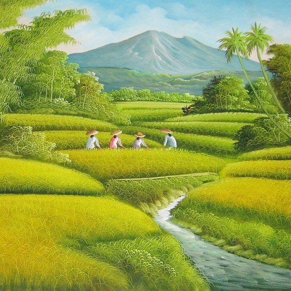 Lukisan Feng Shui Panen Padi Pembawa Kemakmuran - ukuran 80x60 cm.Lukisan panen padi ini terlihat sangat menenangkan dan damai, dengan suasana asri pedesaan. Dengan latar belakang gunung yang tinggi berwarna biru, di tambah rimbunnya pepohonan di kanan kiri, semakin menambah kesan sejuk dan tentram dari lukisan panen padi ini.Secara makna / feng shui, lukisan panen padi atau panen raya menyimbolkan akan sebuah kemakmuran dan berkelimpahan rejeki, memberikan semangat dan menciptakan keadaan yang makmur dan sejahtera.Ukuran lukisan ini:Lebar: 80 cmTinggi: 60 cmCatatan: Pengiriman lukisan digulung (kanvasnya saja, tidak termasuk rangka kayu ataupun fr